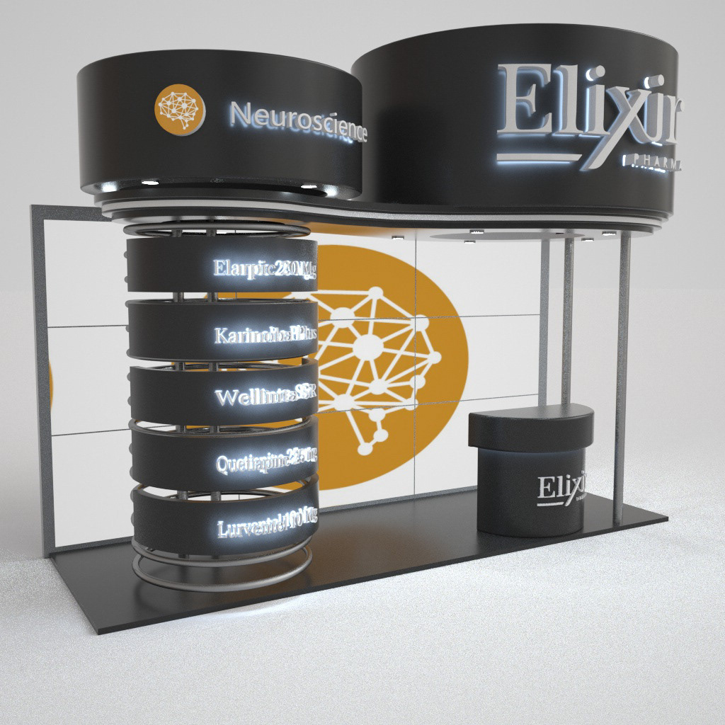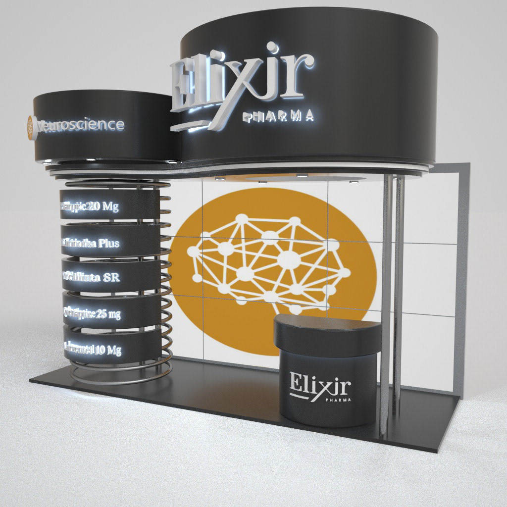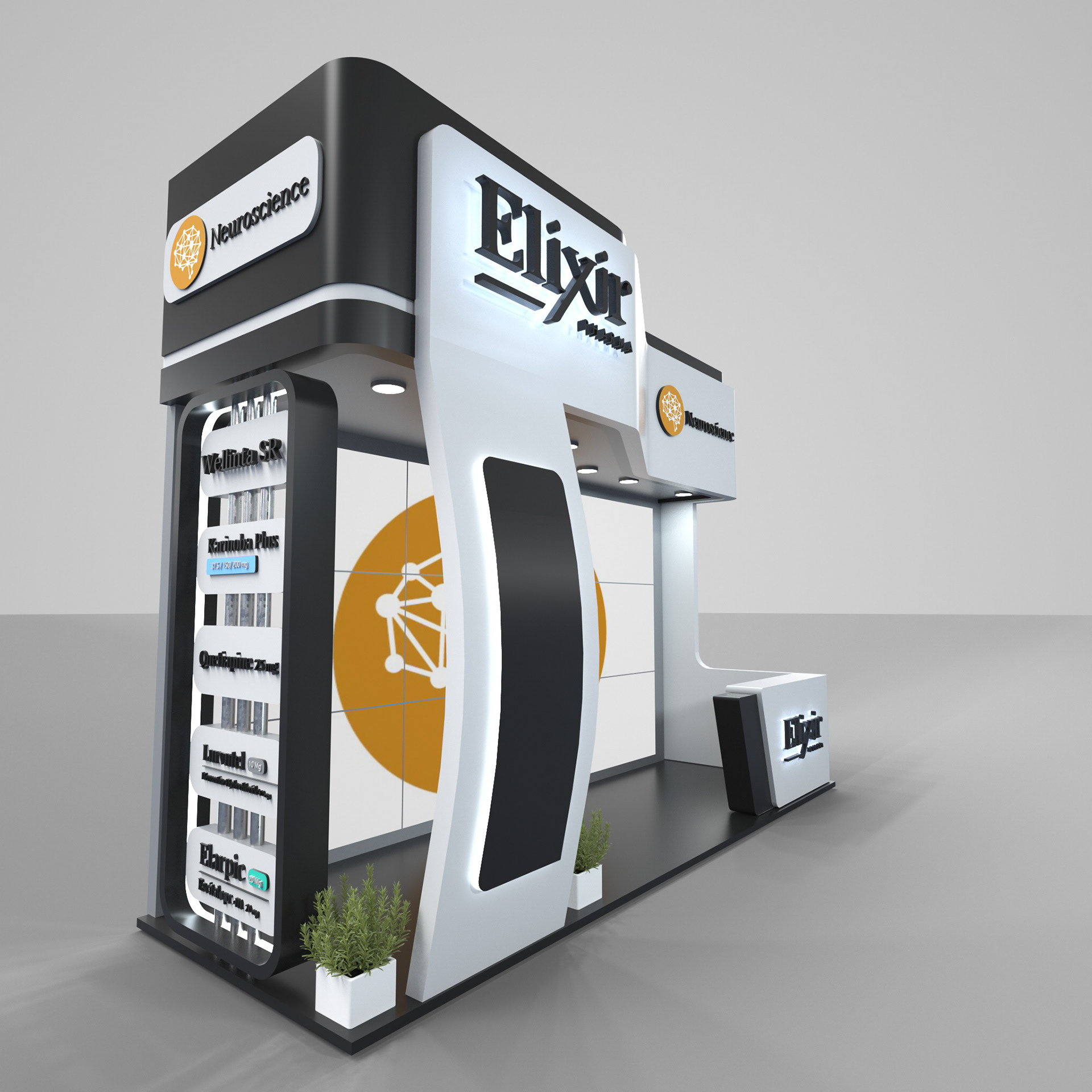 A refined and modern booth design reflecting Elixir’s identity, combining elegant aesthetics, clean structure, and engaging visual elements to create a memorable and immersive brand experience.