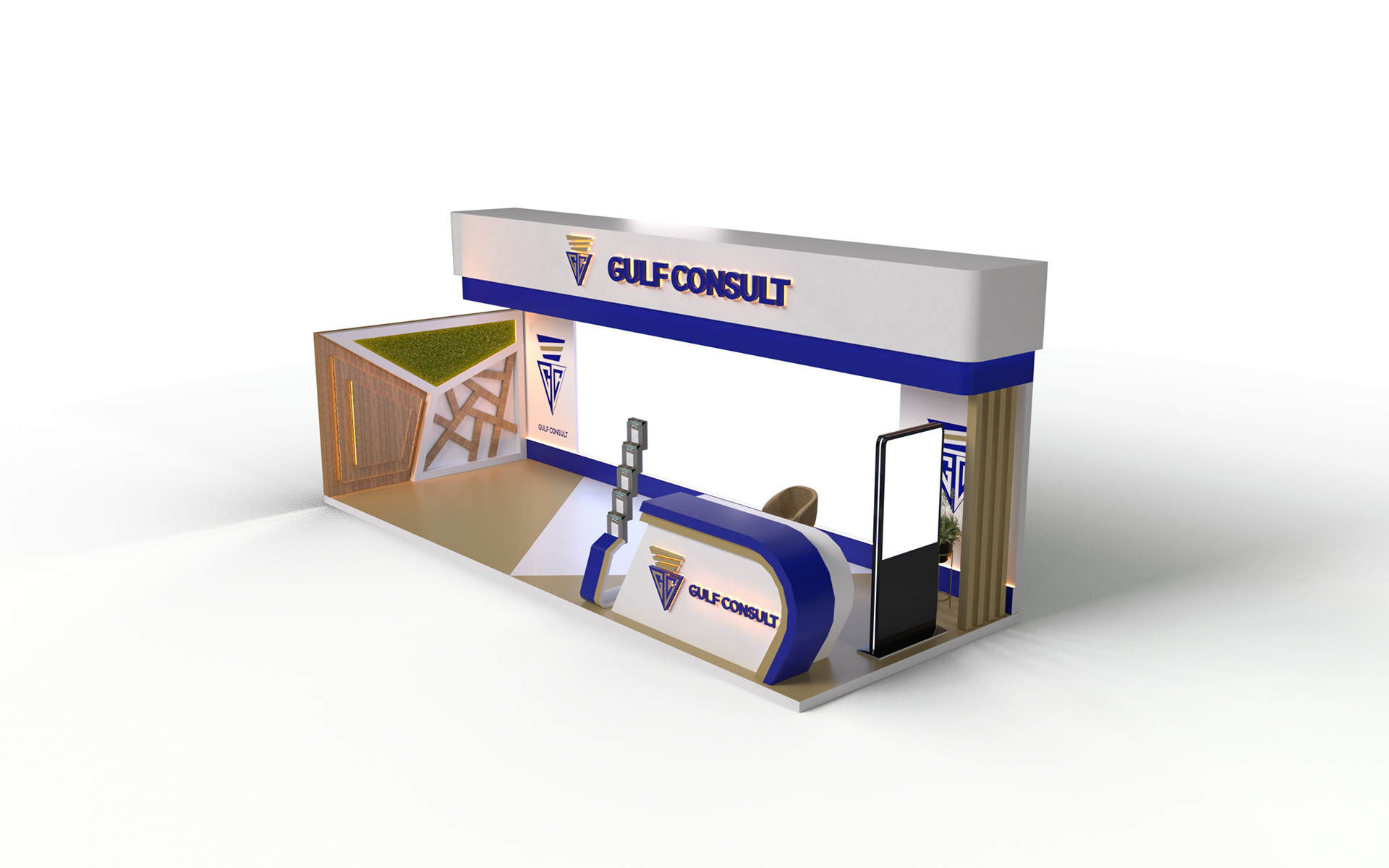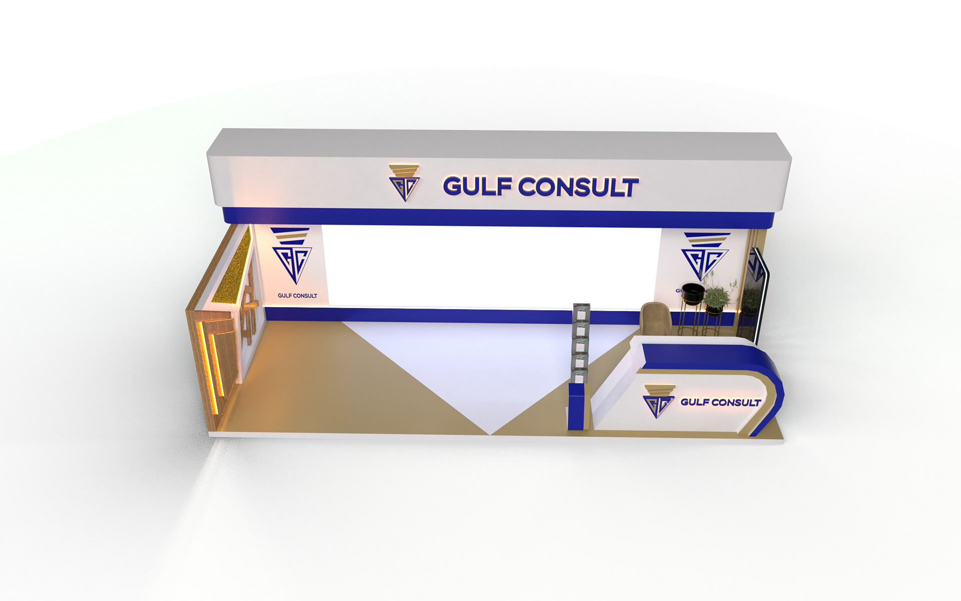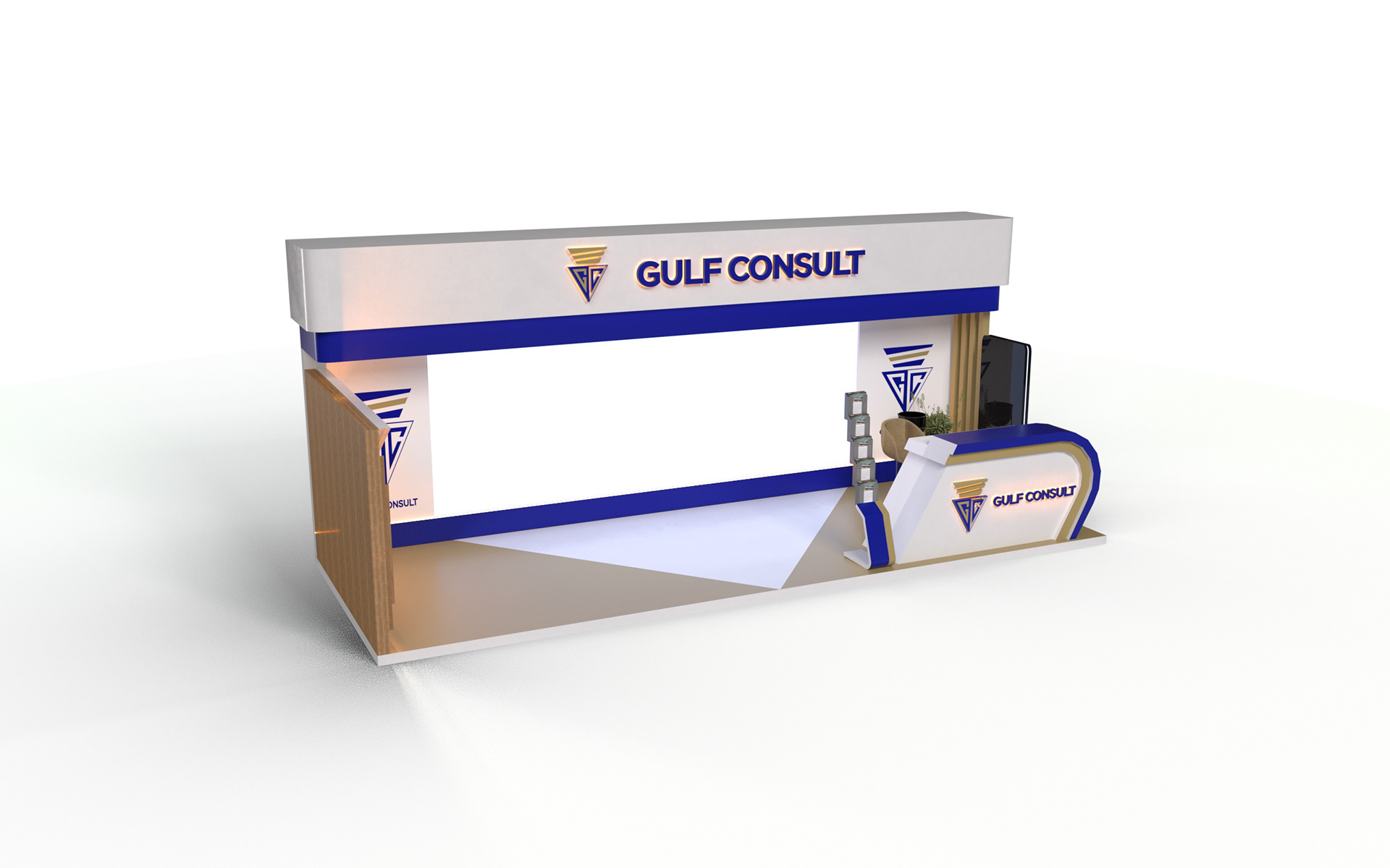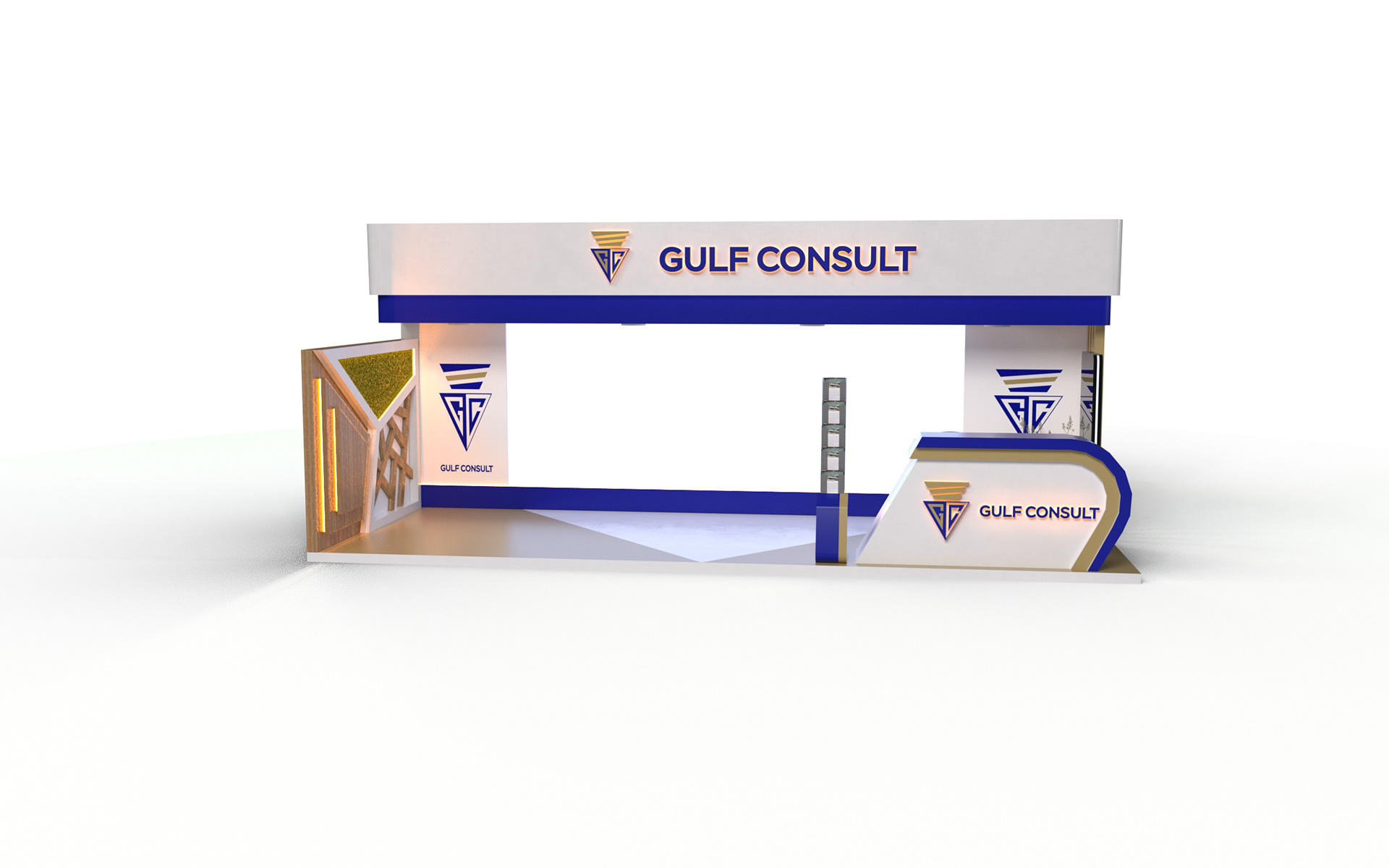 A sleek and modern booth designed to reflect Gulf Consult’s professionalism and engineering excellence, featuring clean architectural lines, bold branding, and a welcoming reception area that enhances client engagement and brand presence.
