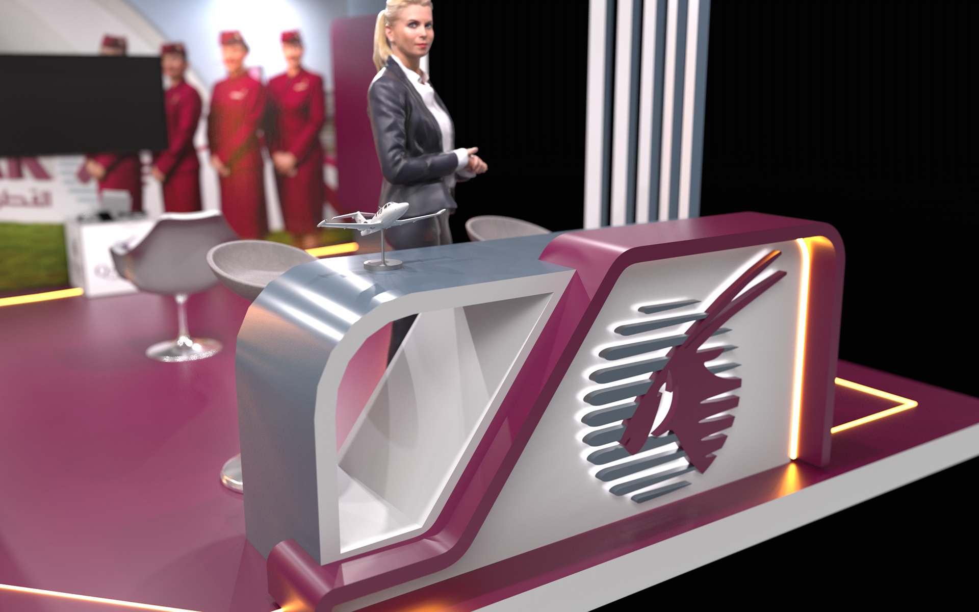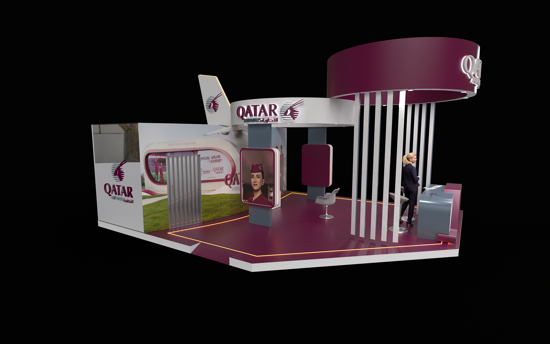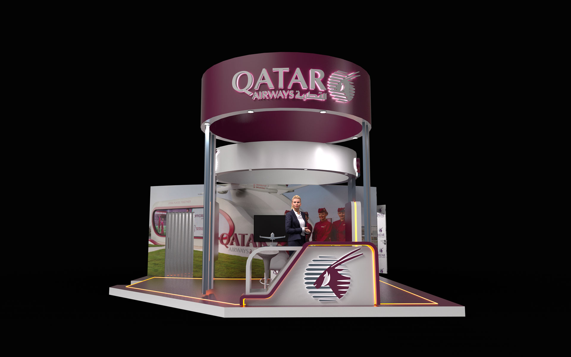 A premium booth design inspired by the elegance and global identity of Qatar Airways. The space reflects a seamless blend of luxury, innovation, and hospitality, featuring refined materials, immersive visuals, and a welcoming layout that enhances visitor engagement and brand experience.