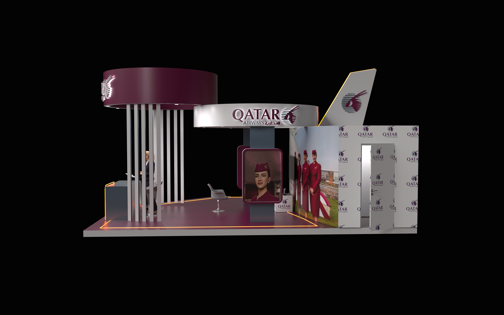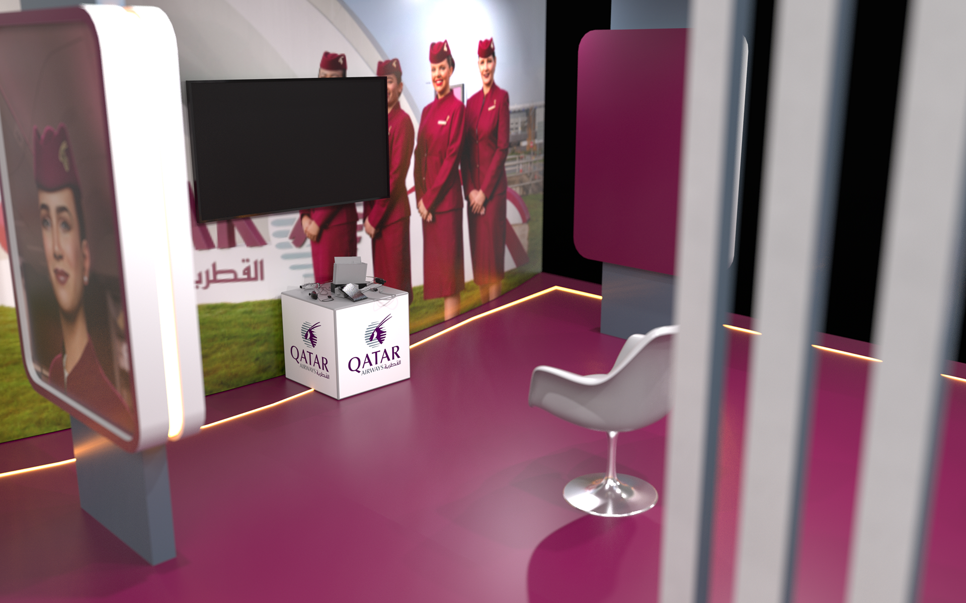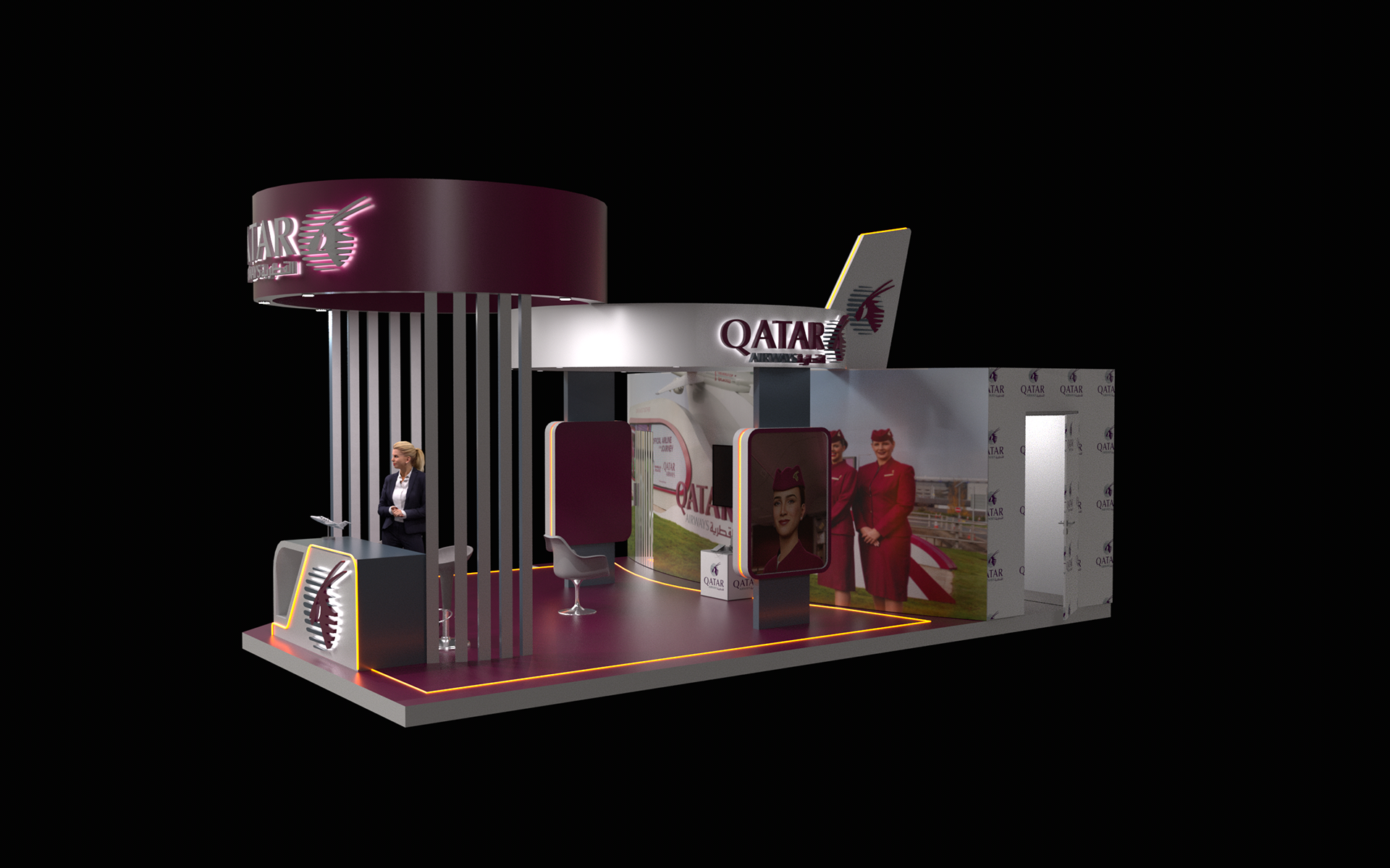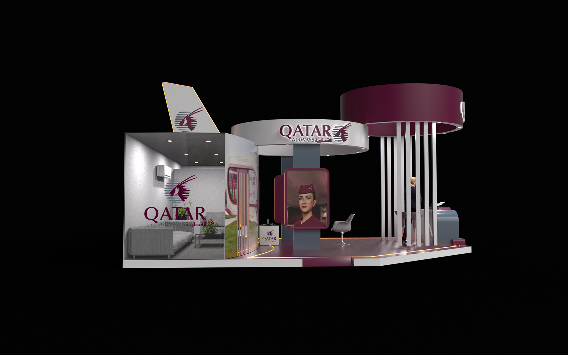 A premium booth design inspired by the elegance and global identity of Qatar Airways. The space reflects a seamless blend of luxury, innovation, and hospitality, featuring refined materials, immersive visuals, and a welcoming layout that enhances visitor engagement and brand experience.