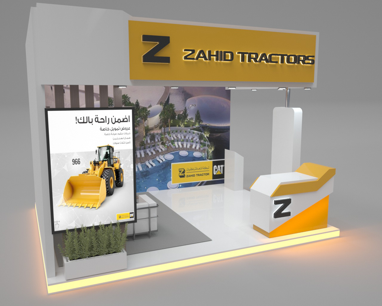 A bold, industrial-style booth designed to reflect Zahid Tractors’ strength and heavy equipment expertise, featuring robust structures, clear branding, and an engaging layout that highlights machinery and services.